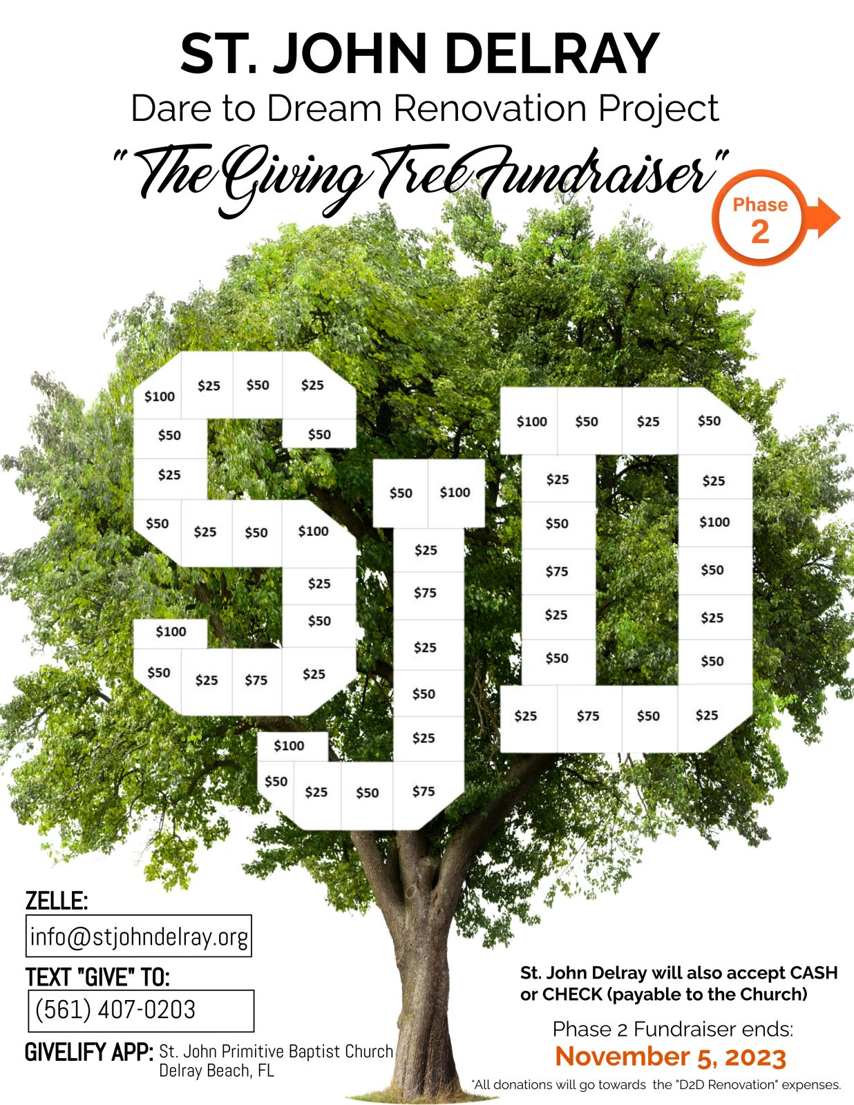As a voluntary donor, you can help us raise funds to renovate our building where we can do more community outreach and grow our congregation. We need your help making our Church building dreams a reality. If you are able to do so, in Phase Two of our D2D Project - "The Giving Tree Fundraiser," we are asking for donations of $25, $50, $75 and $100. No amount is too small, and we will gladly accept any amount, because every dollar counts and brings us closer to our goal.